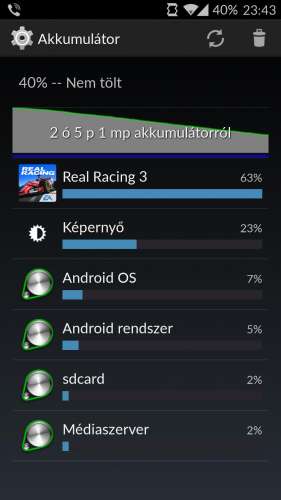 Folyamatos wifi 2 e-mail szinkrozálás 5 percenként mellet Facebook és társa is telepítve. De most ezeknek nem volt nagy szerepe az akku fogyasztásban. Na szóval feltöltotem teljesen majd el kezdtem játszani folyamatosan megállás nélkül a Real Racing 3-on. Melegedés is volt azért (22-25 fok van a szobában) leginkább a kamera volt forró. És íme a hogy mennyit bír a telefon játék közben