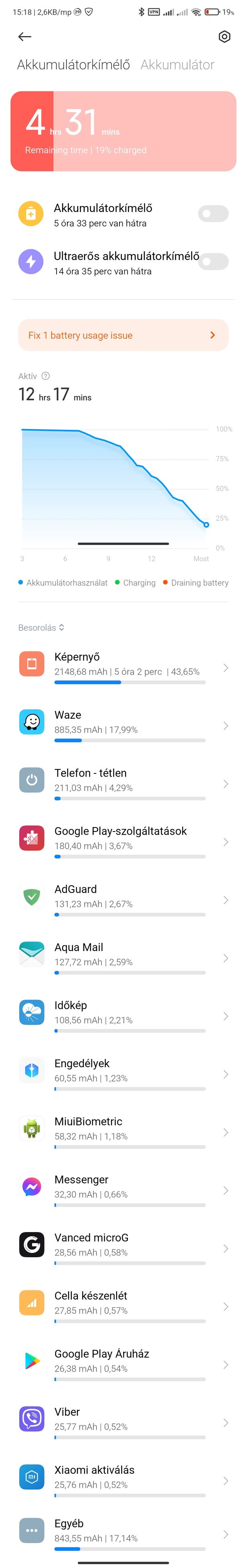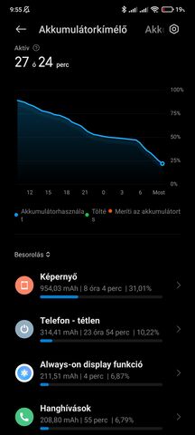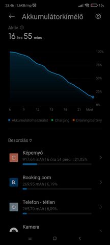 Sot: 6,5 óra. 70% dual sim 4G, 30% wifi. 2 óra BT, kb. 1 óra screen mirroring, automata fényerő, 90 hz. -