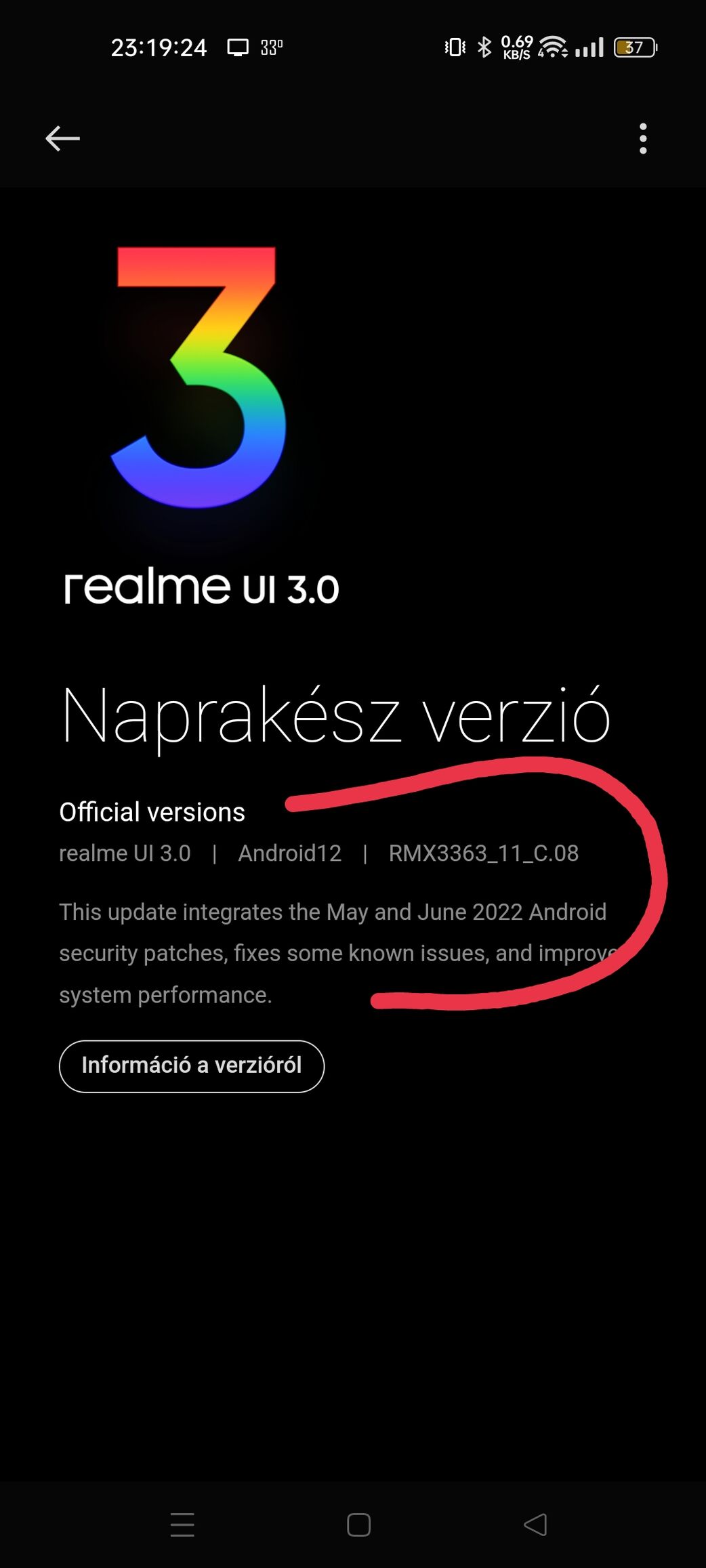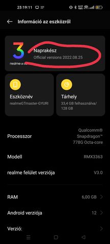 Ja, igen, 8/256-os a gép és valami szép szívárványos 3-as szerepel a rendszernél, naprakész verziót ír, RMX3363-as modell, V3.0 a felület verziója ( bár tudnám mi ez