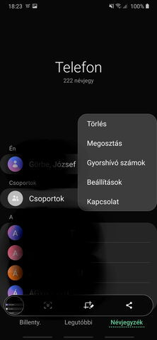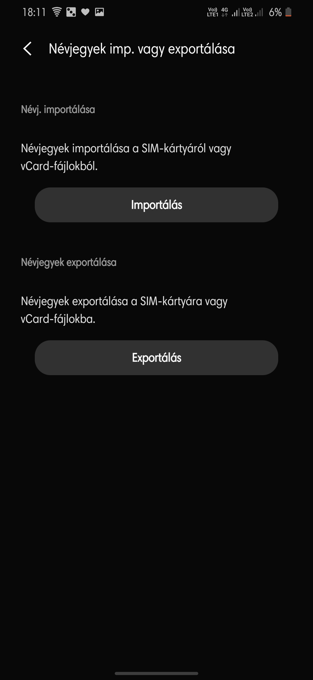 Névjegyek - szendvicsmenü - névjegyek kezelése - névjegyek imp. vagy exportálása - importálás/exportálás