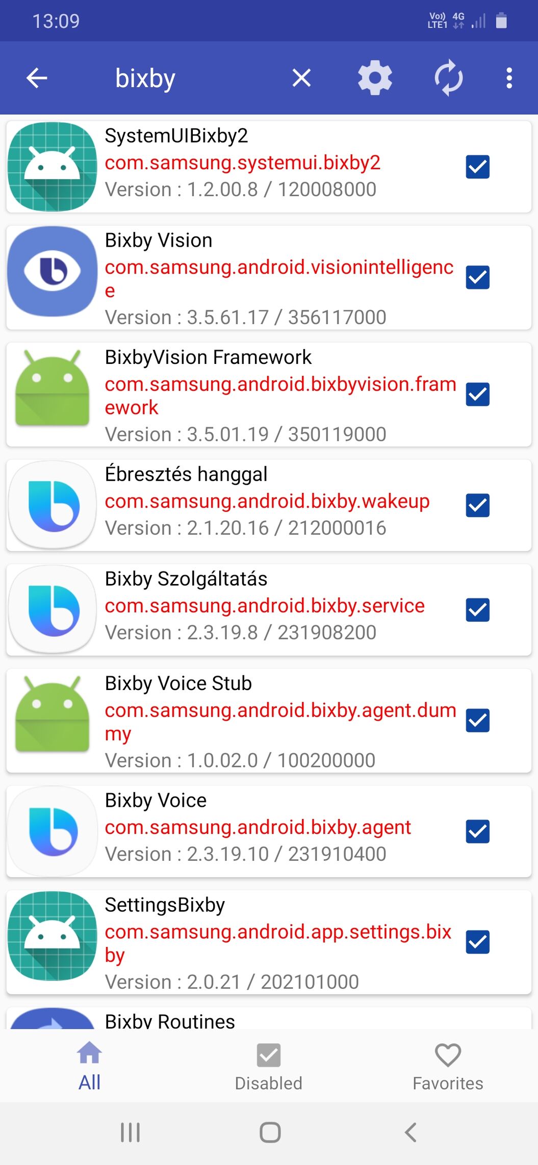 Utána a bal felső menüsorban "All packages", nagyító ikonnal az összes k**rva Bixby csomag megkeres, majd pipa a jobb szélen. És lőn örö meg bódottá
