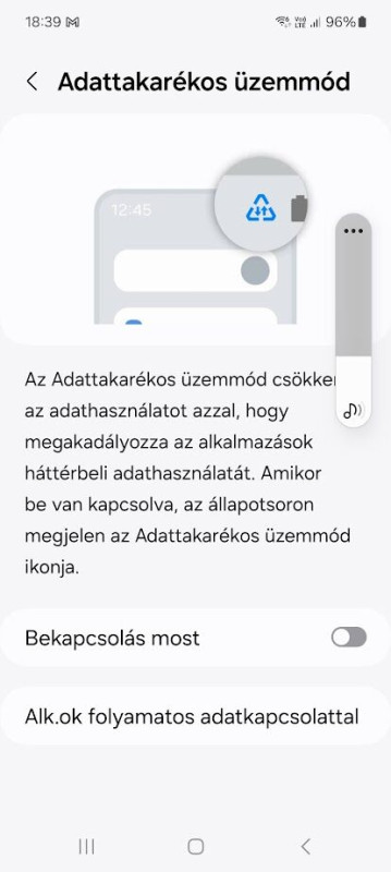 Az, az adatforgalom-csökkentés (Data Saver) funkciót jelöli.