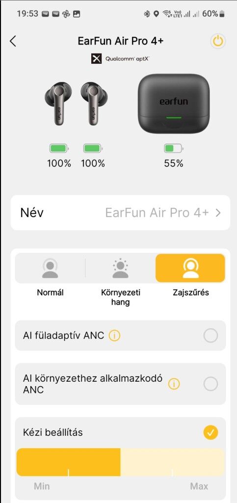 Mindkettőt próbáltam. Azt hittem a kézire állítás segít, de nem. YT-videó közben nézetem a az EarFun beállítását, amikor váltott, akkor megállt a lejátszás, majd visszaváltott és folytatta, majd megint kezdte újra. Nem tudom, hogy azért áll meg, mert vált Zajszűrésről Normálra, ilyenkor nincs lejátszás, vagy pont azért vált, mert megállt a lejátszás. Ha csak zenét hallgatok, akkor is vált, de nem áll le.