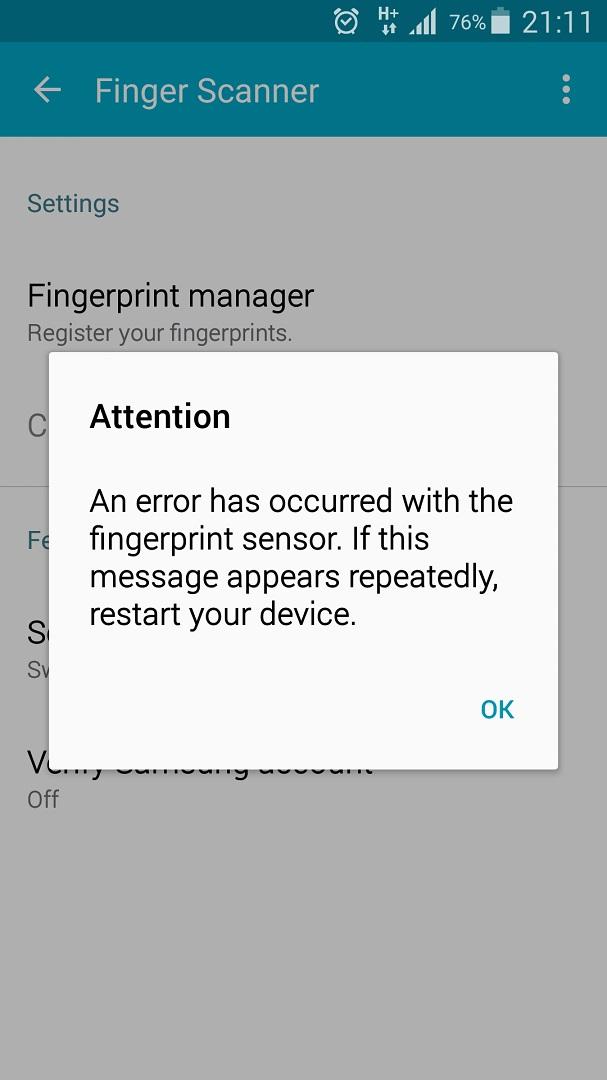 Nem csak nem tudtam ujlenyomattal feloldani (bevallom elegge szeretem ezt a feature-t) de mikor gondoltam sebaj benezek a beallitasokba es rogzitem a lenyomatokat ujra akkor is jott ez a kepen lathato hibauzi.