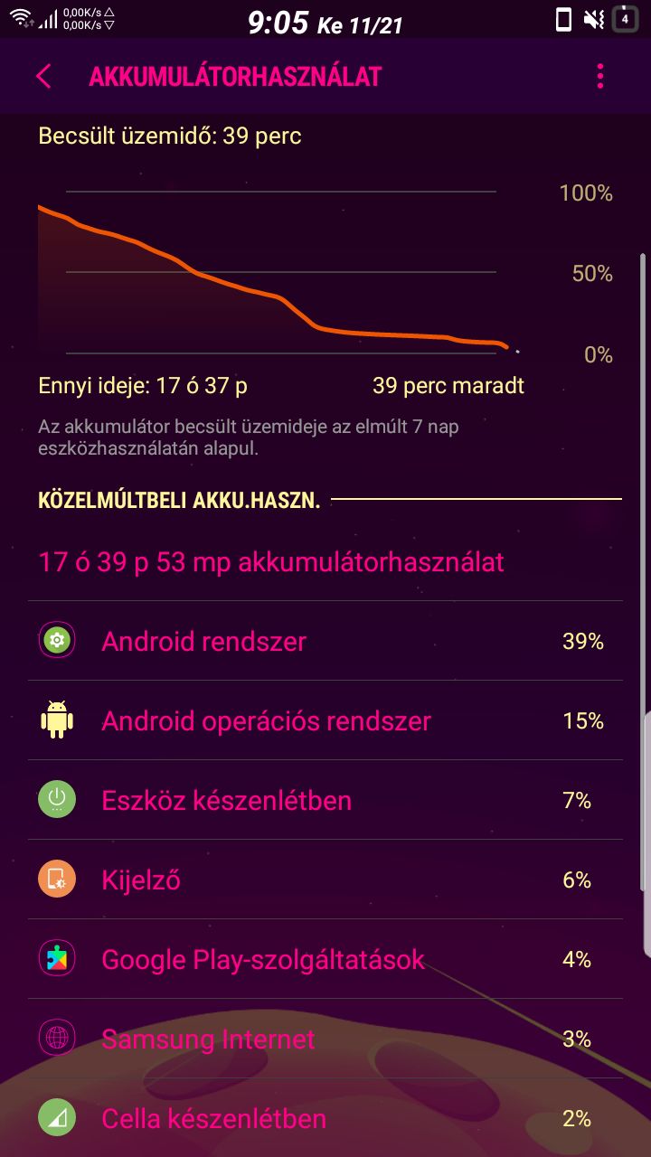 - Az enyém is, a kezdetek óta, itthon ~8-10% között merül 4G -n, mindegy , hogy éppen melyik frissítéssel figyelem. Elég tré a térerő nálunk (2-es), de 3G-n picit jobb (nappal full, éjszaka 3-as ... -vodás vagyok..), és úgy kevesebbet ~7% körül. Minél gyengébb a térerő, annál többet erőlködik a készülék, és többet is fogyaszt. Esetleg, ezzel kapcsolatban érdemes elolvasni még Keem1 tapsztalatát is, mert lehet, hogy esetleg ilyesminek is szerepe van ebben. Nem tudom, hogy nálad ez(ek) miként alakul(nak)...