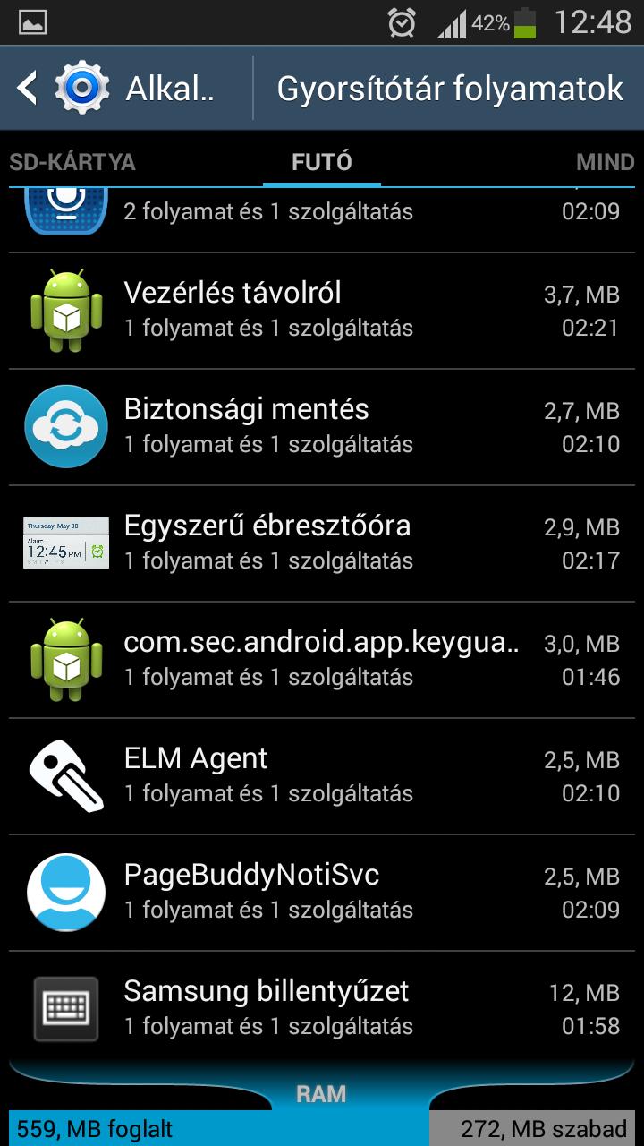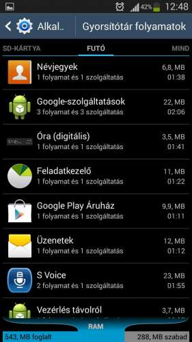 Srácok, segítsetek kérlek! A telóm - Samsung Galaxy S III I9300 - elég rendesen be van lassulva. Nézegettem az alkalmazáskezelőben az éppen futó, ill. a gyorsítótárban lévő programokat és azért meg kell hagyni, hogy nem kevés program van. Ti mit mondtok, mit tudnék csinálni, amivel gyorsítani tudnám a telót? Csináltam az előbb említett programokról egy listát - képernyő fényképezéssel. Kérlek fussátok át, hogy szerintetek melyek a feleslegesek. Meg hogyan tudnám ezeket végleg bezárni? Pl. ott van a S Voice. Nem is használom és mégis fut. Bezárom és egy teló újraindításánál ismét elindul. Kérlek segítsetek! Előre is köszönöm!