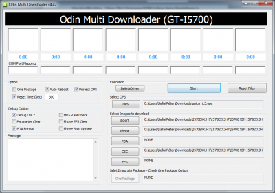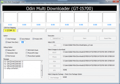 ) és mint Samsung mobile modem. Így Odin felismerte, beillesztettem a boot, ops stb nyomtam egy startot, és megáll így:Közben persze a telefon nem csinál semmit, csak a downloading... képet mutatja.