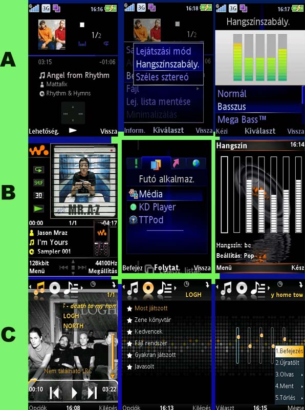 Ha ma valaki zárt op.rendszerű telóban gondolkodik, ezt a típus már 20 000Ft- tól meg lehet venni, természetesen használtan. Ár és tudás viszonyában az egyik legjobb vétel.Természetesen nem árt, ha valaki jártas az informatikában, de jó kezekben nagyon hálás tud lenni. A Java alkalmazásokkal nem lesz gond, mint más márkáknál ill. szakértő kezek nagyon tudják tuningolni, lásd Lazy. Itt egy kép három zenelejátszóról: A sor SE saját lejátszója, B sor KD Player ill. a középső kockán az látható, hogy egyszerre is megnyithatóak, nem fog hátast dobni a teló, C sor TTPod látható. Mindhárom lejátszónak vannak előnyei ill. hátrányai, de abban megegyeznek, hogy teljes értékű zenelejátszók. Természetesen magyar menüvel.