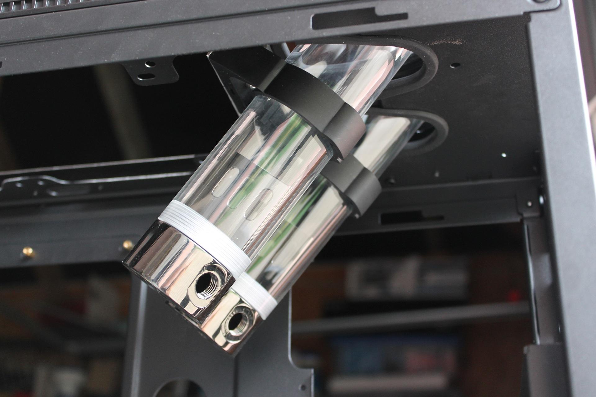 A mozgató mechanika alatt lesz a procit hűtő 280-as radi, push-pull ventikkel. A 2 db tartály megdöntve egymás mellett a motor alá lesznek berögzítve, így a feltöltés az 5,25"-os helyek felől történik majd.