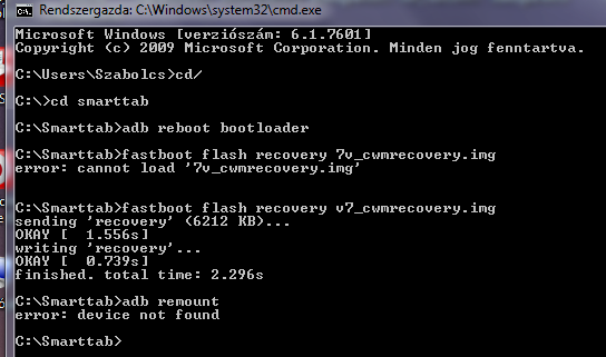 adb reboot bootloader és mehet a cwm install . Ha felment akkor belépsz a cwmbe. és vársz egy kicsit ,míg adb -n keresztül látszik a gép.