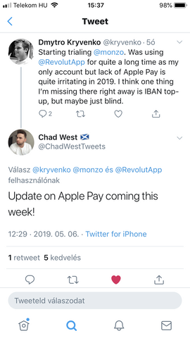 pár hete március 11-én raktam be először Apple Pay-re a Monese kártyámat
