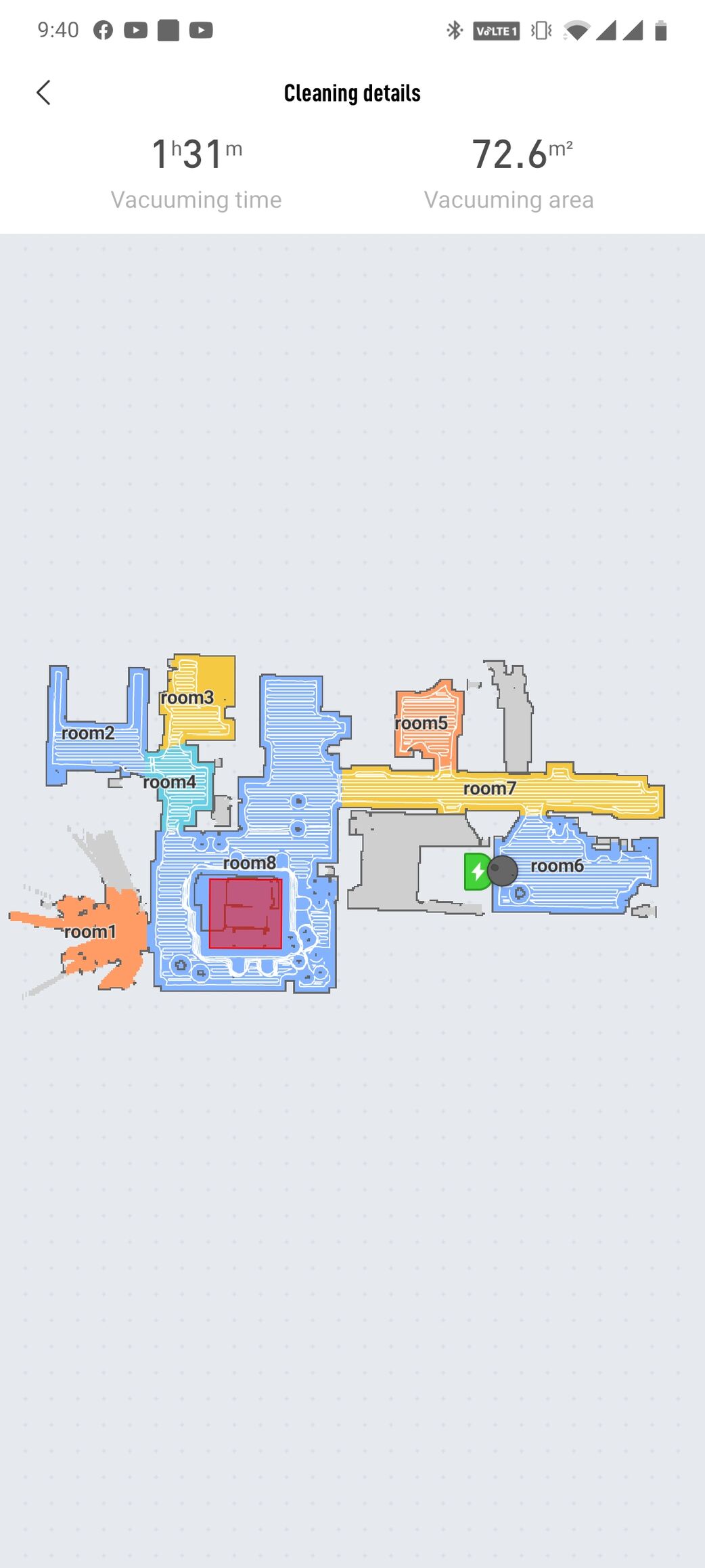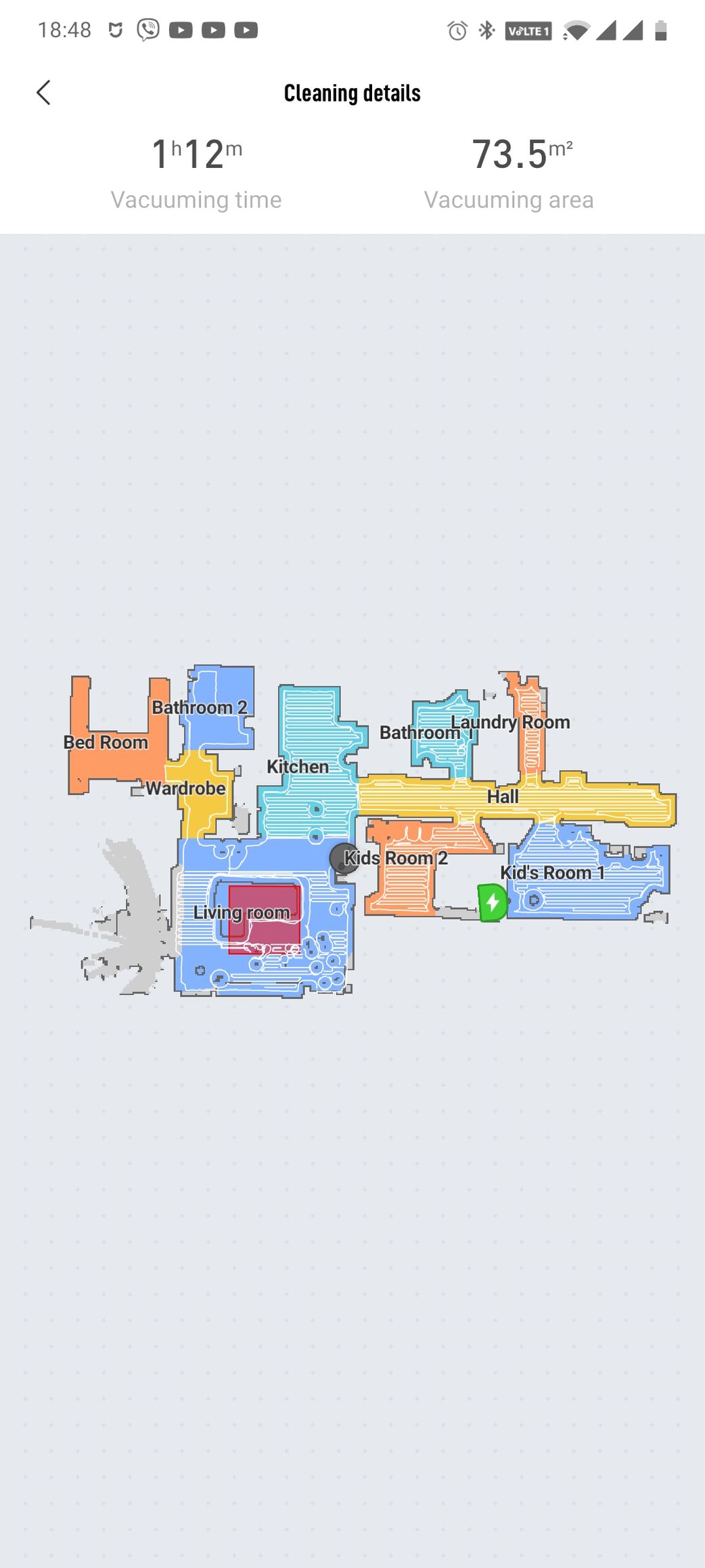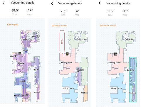A "hasznos" terület ~100m2 a házban, ebből 2 helység kizárásával (becsukott ajtó) 49-et takarított 60 perc alatt, 94%-ról 42-re esett vissza az akksi szint. A helyiségeket szétdarabolta, manuálisan kellett összeollózni, hogy mik tartoznak egybe.