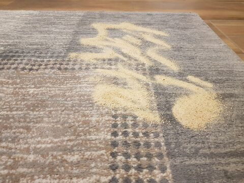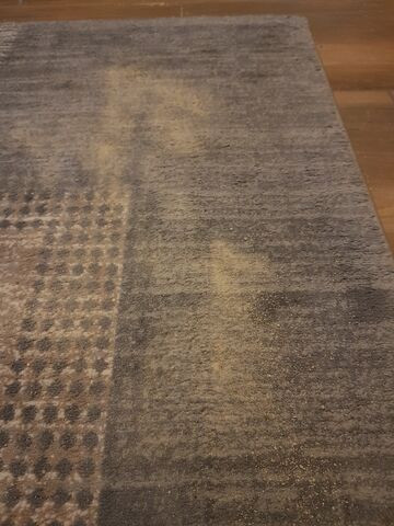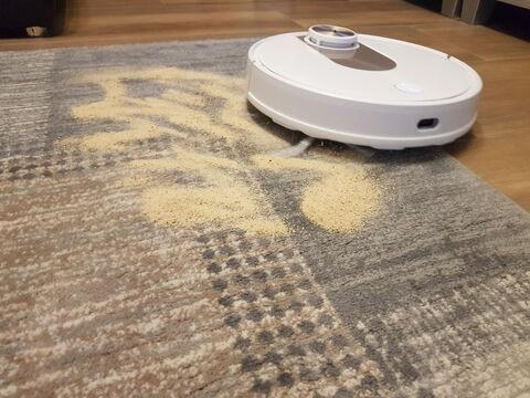 Próbáltam a legáltalánosabb szőnyegen kipróbálni,ezért egy közepes szálhosszakból állóra esett a választás. Tapintásra már puhának érződik szövet,ezáltal nehezebb dolga volt a Viomi-nak mintha egy lábtörlő szőnyegen kellett volna felporszívóznia. Búzadarát öntöttem ki,mert a lisztet túl finomítottnak gondoltam. Ez közelebb állt az általános "koszhoz".