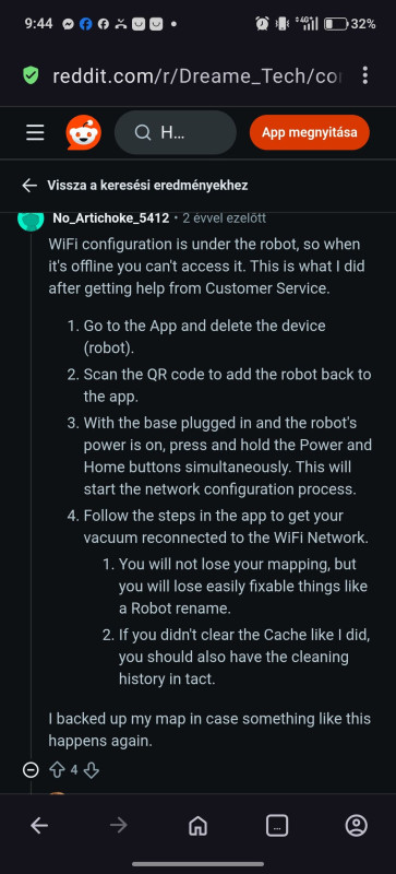 Az elején a párosítás és frissítés letöltés némileg bugosan lassú az otthoni wifiről, erre bypass megoldás a mobil hotspot, valamiért ezt jobban szereti. Utána mehet vissza rendesre és működik gond nélkül. Ezt a Roborock hiba nélkül hozta mindig, minden mindig azonnal működik.Az elején némán körbemegy az ingatalanban, mindenhová bekukkant, ügyesen feltérképez előre, így nincs olyan tanuló első takarítás, mint az S7 esetében, ez tökjó.