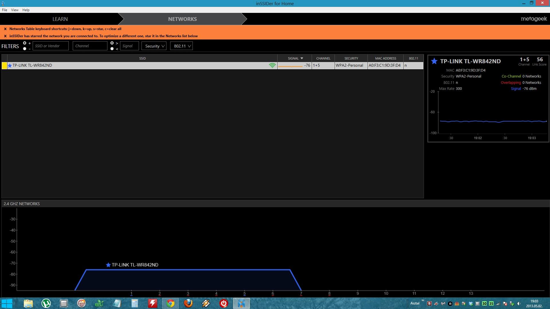 Az inSSIDer kép alapján nincsen semmi zavaró hálózat, ez nagyon jó.