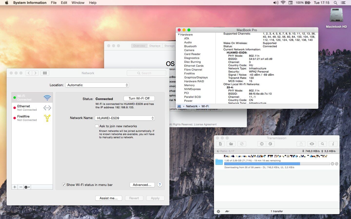 Érdekesség még, hogy az egyik bevásárlóközpontban lévő telenorban egy segítőkész kolléga behozta, a saját azonos típusú routerét mert arra jutottunk, hogy hátha kérdés nélkül lefrissítette magát a router (mivel tőlem sohase kérdezte, mégis "naprakész", szóval vagy automatán lemegy vagy sose frissült és két éve ugyanaz) és az új fw ilyen jól sikerült. De mivel az övé sim nélkül pihen fél éve , így lehet korábbi fw-n van. Próba: sim be, boot, csatlakozik és sebesség ugyanúgy lassú 1MB/s alatt mint az enyémen, admin felületén nézve a fw verzió azonos. Ugyanott, ugyanúgy, ugyanakkor a kolléga telenor 4g-ről iphone hotspot módban: 4MB/s tud ugyanaz a sok seed-es torrent. Ilyenkor mi van? Mind a ketten néztünk mint hal a szatyorban...A gépem és amit lát itt az ablak mellett: