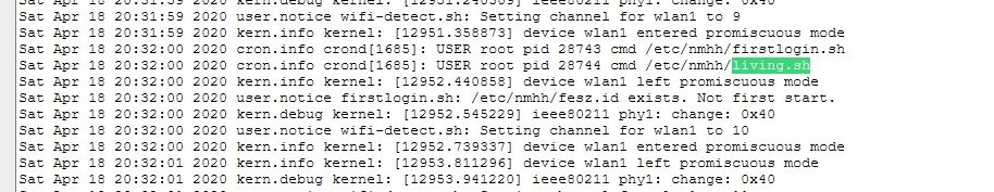 Tue Apr 21 11:35:12 2020 user.notice living.sh: U-boot or SquashFs partition changed. Exiting.Tue Apr 21 11:35:33 2020 daemon.err odhcp6c[2856]: Failed to send DHCPV6 message to ff02::1:2 (Permission denied)Tue Apr 21 11:35:41 2020 daemon.err uhttpd[1737]: unable to write 'random state'Tue Apr 21 11:35:41 2020 daemon.err uhttpd[1737]: Unable to determine args save fileTue Apr 21 11:35:44 2020 daemon.err uhttpd[1737]: Unable to determine args save fileTue Apr 21 11:35:47 2020 daemon.err uhttpd[1737]: Unable to determine args save fileTue Apr 21 11:35:50 2020 daemon.err uhttpd[1737]: Unable to determine args save fileTue Apr 21 11:35:53 2020 daemon.err uhttpd[1737]: Unable to determine args save fileTue Apr 21 11:35:56 2020 user.notice promptmeasure: Port knocking not opened the https port.Tue Apr 21 11:36:00 2020 cron.info crond[1686]: USER root pid 12263 cmd /etc/nmhh/firstlogin.shTue Apr 21 11:36:00 2020 cron.info crond[1686]: USER root pid 12264 cmd /etc/nmhh/living.shTue Apr 21 11:36:00 2020 user.notice firstlogin.sh: /etc/nmhh/fesz.id exists. Not first start.Tue Apr 21 11:36:00 2020 user.notice living.sh: CC available. Killing PPPoE captureTue Apr 21 11:36:00 2020 user.notice living.sh: Killing all processes with name detect-pppoeTue Apr 21 11:36:00 2020 user.notice living.sh: myKillAll killed 0 processesTue Apr 21 11:36:00 2020 user.notice living.sh: Killing all processes with name pppoe-captureTue Apr 21 11:36:00 2020 user.notice living.sh: myKillAll killed 0 processesTue Apr 21 11:36:03 2020 user.notice living.sh: Traffic: 141.77 MBTue Apr 21 11:36:04 2020 user.notice living.sh: U-boot or SquashFs partition changed. Exiting.Tue Apr 21 11:37:00 2020 cron.info crond[1686]: USER root pid 12395 cmd /etc/nmhh/firstlogin.shTue Apr 21 11:37:00 2020 cron.info crond[1686]: USER root pid 12396 cmd /etc/nmhh/living.shTue Apr 21 11:37:00 2020 user.notice firstlogin.sh: /etc/nmhh/fesz.id exists. Not first start.