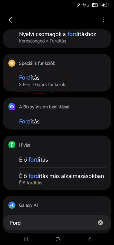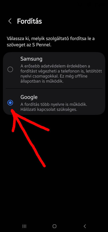 Én nagyon béna vagyok, ilyet nem találok: "Keresőbe beírtam, hogy Fordítás. Kiválasztottam a megjelenő listában a Speciális funkciók/Fordítás S Pen funkciók/Fordítás/ és kiválasztottam a Google-t." A fordítás menüpont alatt nekem csak annyi van, hogy Samsung vagy Google.