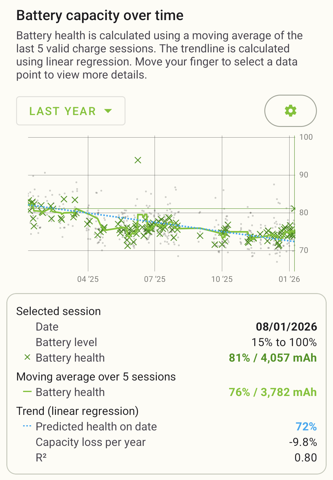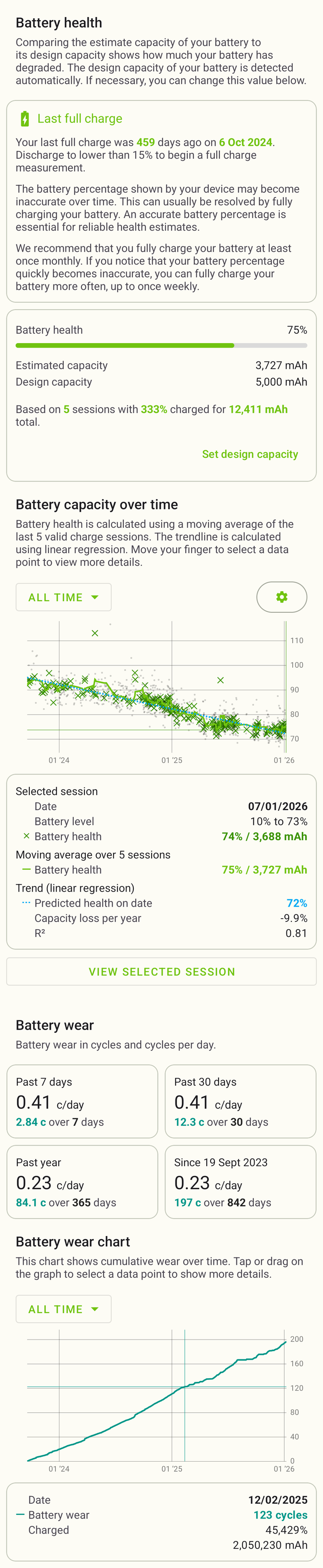 Mióta megvan a telefon, azóta rajta van az AccuBattery alkalmazás is, hogy kövessem az akku állapotát. Lehet, hogy már egy éve is megfeletkeztem az app -ról, de a tegnap eszembe jutott megnyitni. Ez a mérés 2023 szeptembertől mostanáig van [kép], ez pedig a tegnap éjjeli 100% töltés [kép] . Mit gondoltok, hogyan bírja? Rengeteg a napi képernyő időm (vezetés + yt), gyakran van töltőre dugva, és a kezdetektől be van állítva a töltés korlátozás 80% -ra.