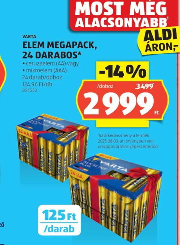 Azt nem tudom, két éve minden karácsony előtt veszek 20db AAA és 20db AA packot az aldiból amikor ilyen 1300-1600Ft között van egy doboz.