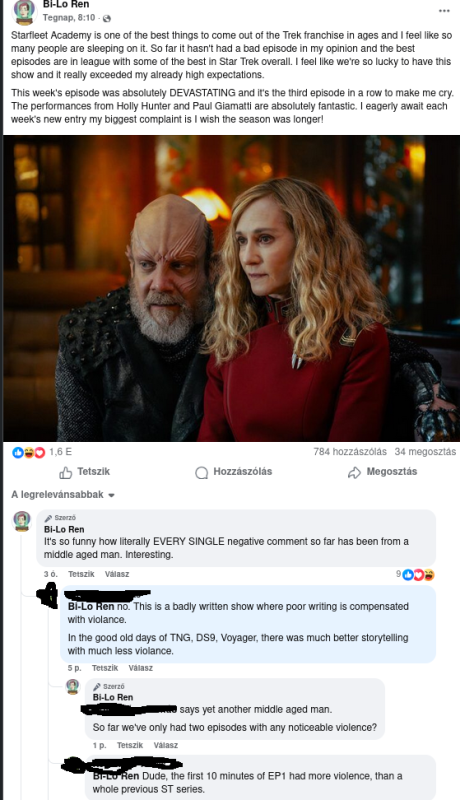 Aszongya a többi trek shóban is sok erőszak volt, Picard, Discovery, stb. Na mondom oké, de ez új trek, ki is nyírtak jó karaktereket ok nélkül... Mondom neki ne csodálkozzon, hogy középkorú embereknek baja van azzal, amit most látunk... Mi még a TNG-n nőttünk fel, Picard kapitány személyében olyan valakit láttunk, aki követendő példa lehet sokunk előtt... sőt, a többi korabeli só kapitányával is így voltunk.