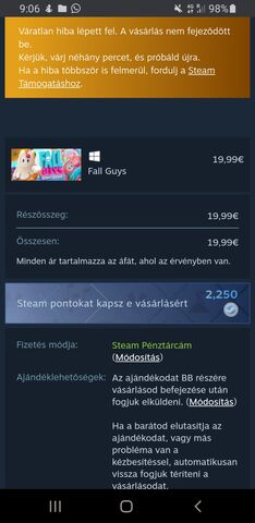 Nem nagyon fog elmúlni, mostanában mintha jobban bekeményített volna a steam a wallettos gift vásárlásoknál. Rendszeresen ilyet ír nekem is (többször próbálgattam), júliusban jó volt utána kezdődtek ezek a sárga üzenetes errorok megjelenni.