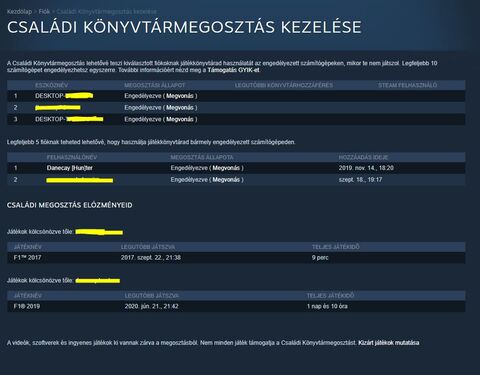 Jó hogy szóba került, mert így újra megnéztem a linkelt felületet, ahol a párom fiókja ugyan szerepel az engedélyezett fiókok között, viszont a eszközök között nem szerepel az ő gépének az azonosítója. A felhasználók közé csak akkor került be az ő Steam azonosítója amikor beléptünk vele az én gépemen, ki is lett pipáltam, engedélyeztem a hozzáférést, de azt nem tudom, hogy akkor az engedélyezett eszközökhöz hogy lehetne hozzáadni az ő gépét?