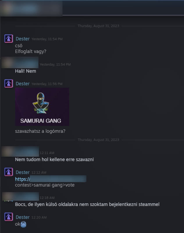 Én a beköszönése után először csak képet kaptam tőle (nem kattintottam rá erre sem, a kérdése kissé magyartalan volt alatta), majd válaszoltam neki, hogy nem tudom, hol kellene szavazni. Küldte a linket, amire nem kattintottam rá, csak beírtam böngészőbe, ahol láttam, hogy Steames bejelentkezést kér, ami nálam felejtős, ezt írtam is neki, aminek nem örült.