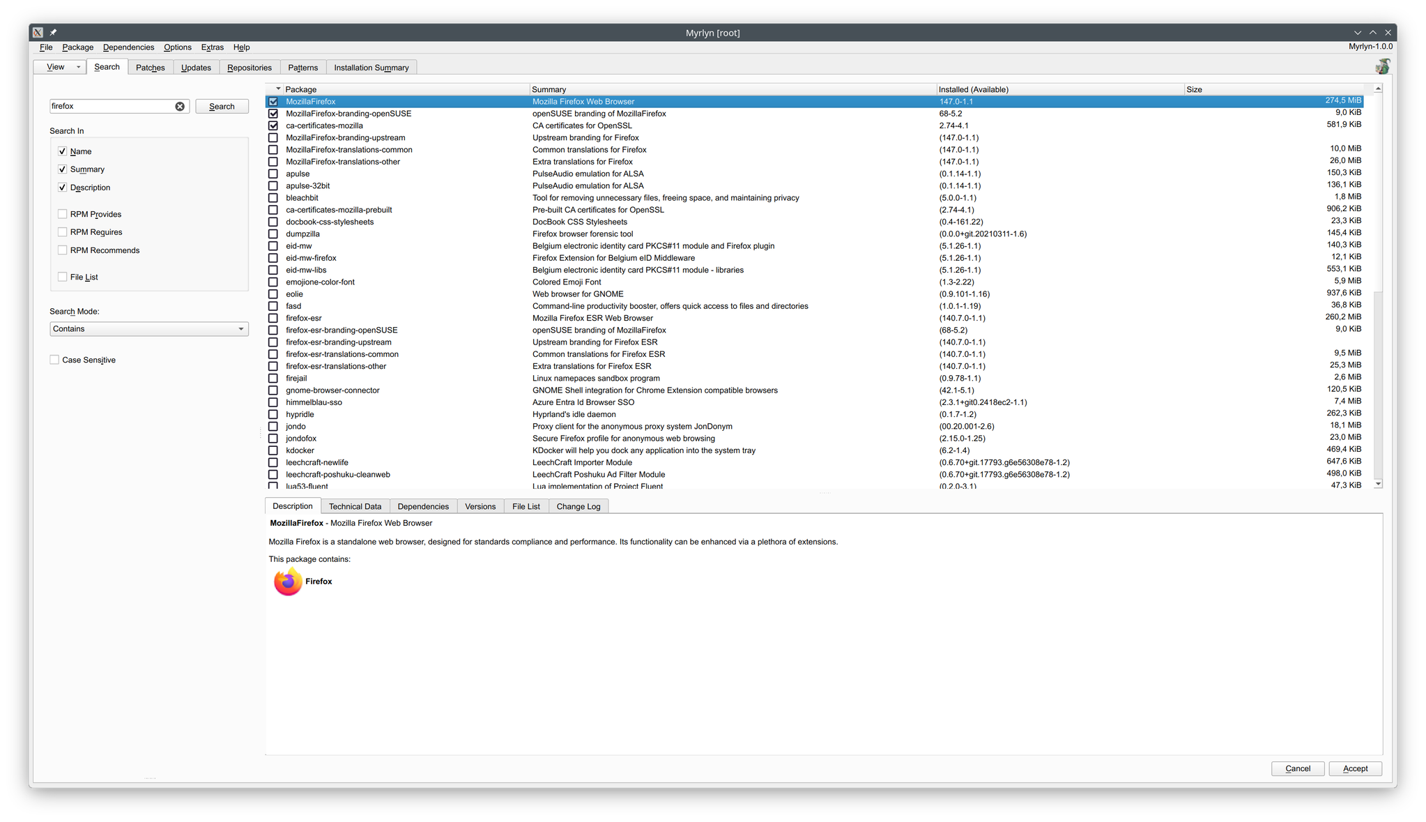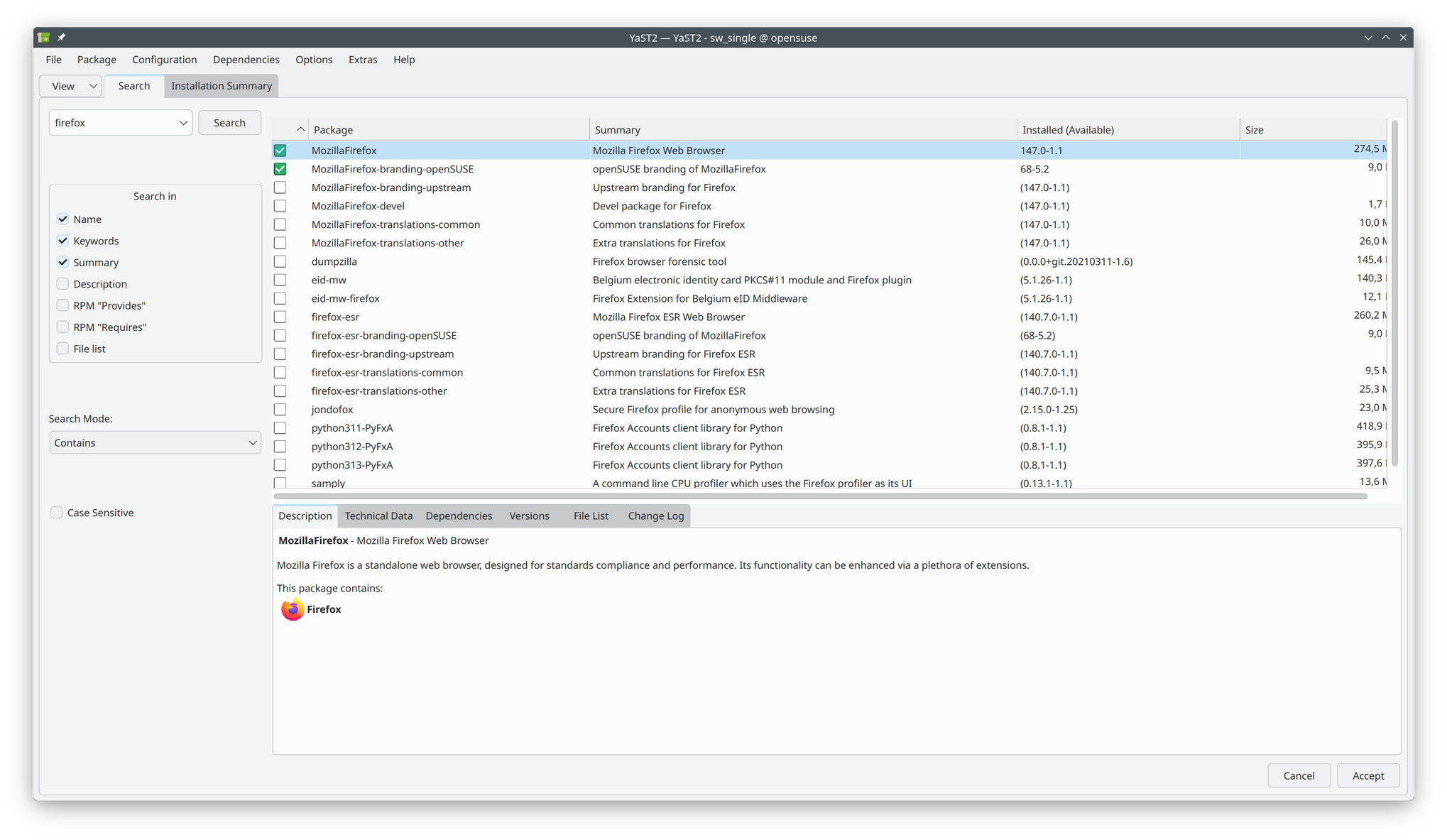 OpenSuse alatt jobban szét vannak bontva a csomagok. Pl. az Inkscape 3 csomagból áll, inkscape, inkscape-extensions-extra, és inkscape-lang. Ha jól látom, ez Arch alatt egyetlen csomag.