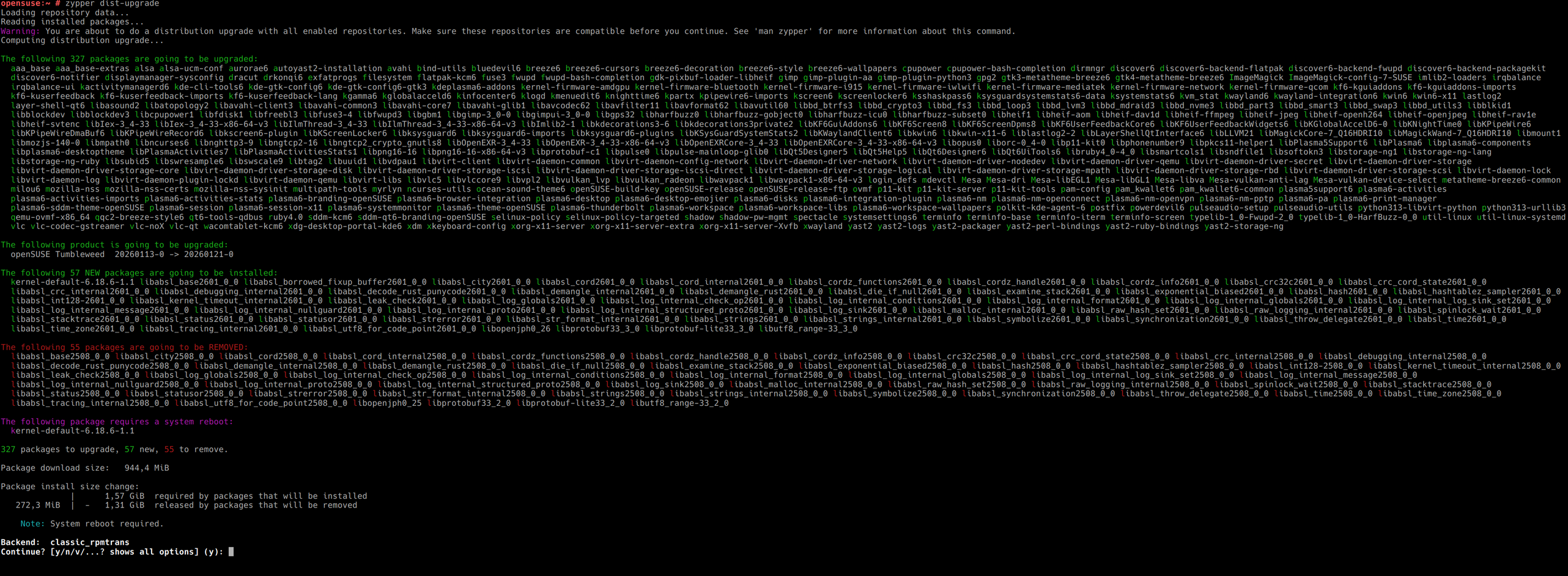 Figyelmeztetés: Disztribúciófrissítésre készül az összes telepítési forrás engedélyezésével. Továbblépés előtt győződjön meg róla, hogy ezek a telepítési források kompatibilisek. A paranccsal kapcsolatos további információ itt található: 'man zypper'.A disztribúció frissítésének számítása...