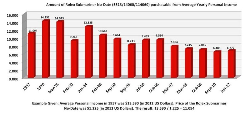 Nem az óra árával van baj, hanem a hazai keresetekkel és vásárlóerővel, 1970-ben még 14 darab ND Sub jött ki éves USA átlagkeresetből, de még 2012-ben is majdnem 7, Dávidnak volt anno egy ilyen cikke, onnan a kép.