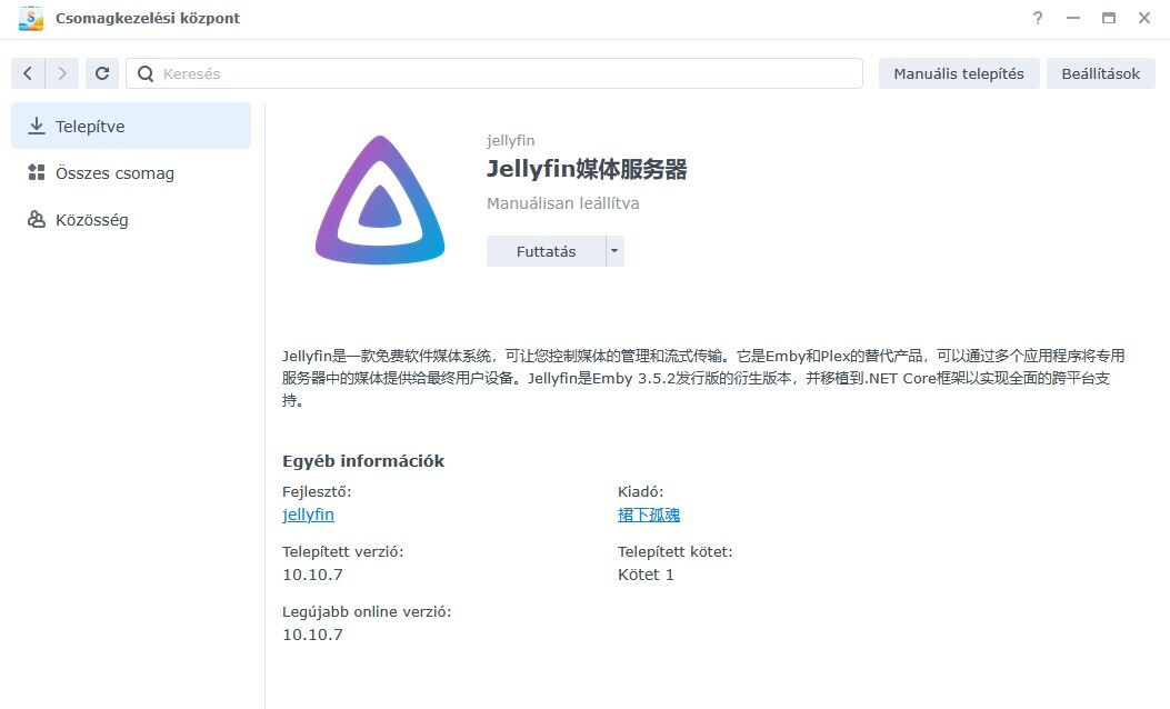 Egyébként Jellyfinből van már SynoCommunity verzió is, az nem "csirkelábas"