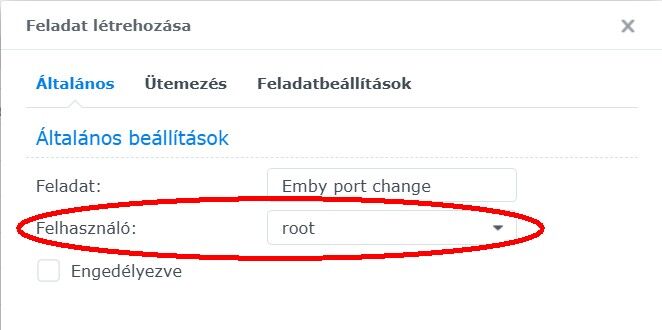 Nem az a lényeg, hogy a DSM-be milyen felhasználóval lépsz be, hanem, hogy az ütemezett feladatot a root nevében futtasd, mert csak neki van joga szerkeszteni az Emby konfigurációs fájlait.