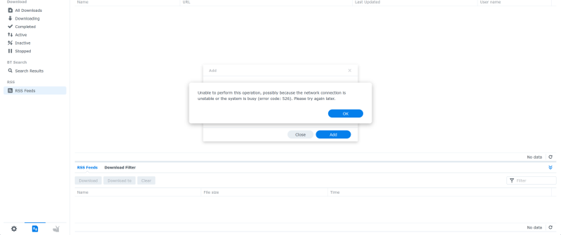 Sziasztok. Egy ideje be volt állítva az RSS automata letöltés kettő kategóriára, linkkel innen, jól is működött, VPN-en, HU szerveren keresztül csatlakozom-csatlakoztam a trackerre, eddig nem volt semmi gond. Egyszer csak azt vettem észre leállt az automata letöltés, próbálom újra hozzáadni a linket, a képen látható üzenet jelenik meg: