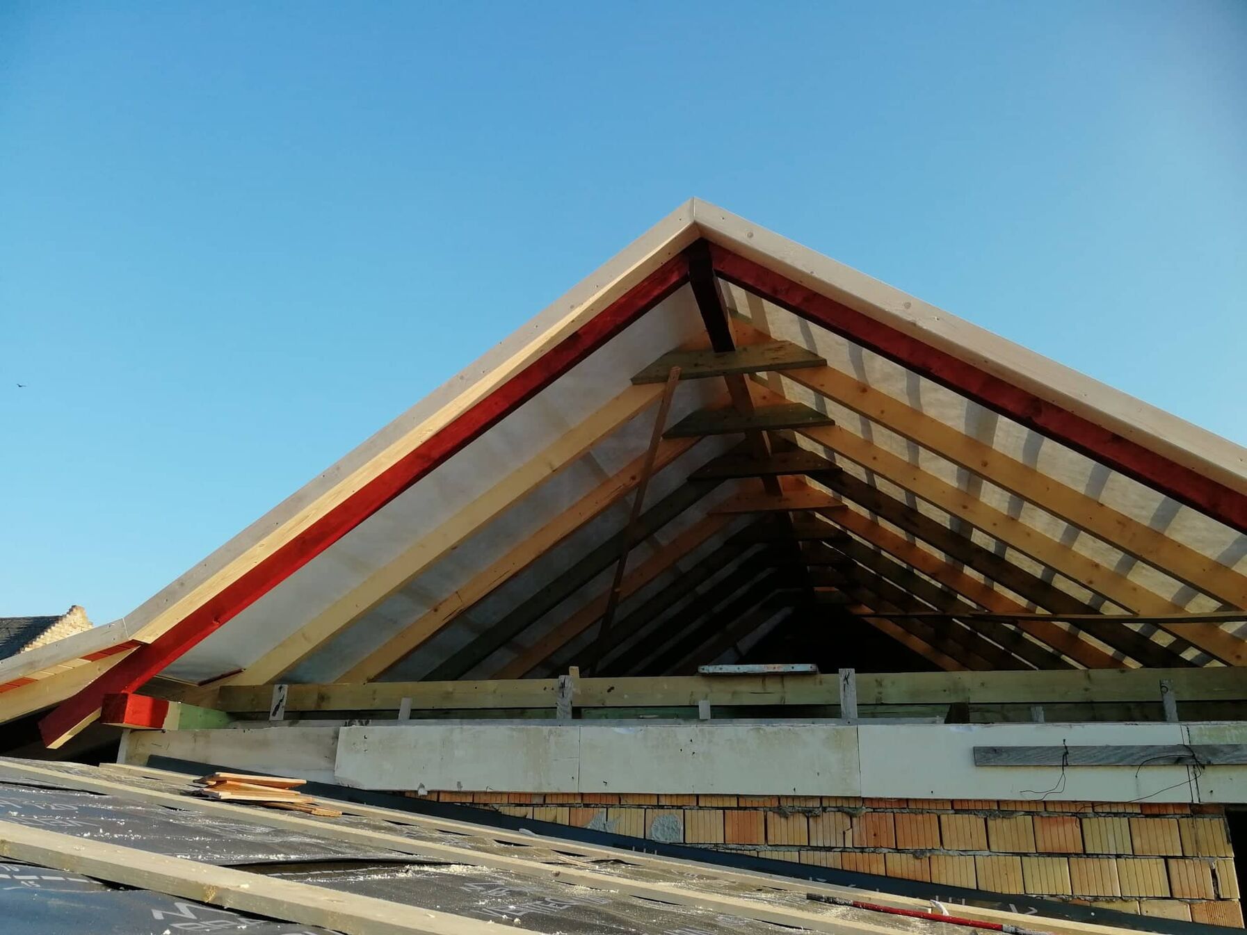 Tegnap fél10-ig ki se tudtam szállni az autóból mert folyamatosan esett. Utána elzárták odafent a csapot és egész jól haladtam. Felszórtam amit tudtam a talpszelemenből és ki is szinteztem azt a részt. Ma fagerendázattal foglalkozunk nagyrészt.