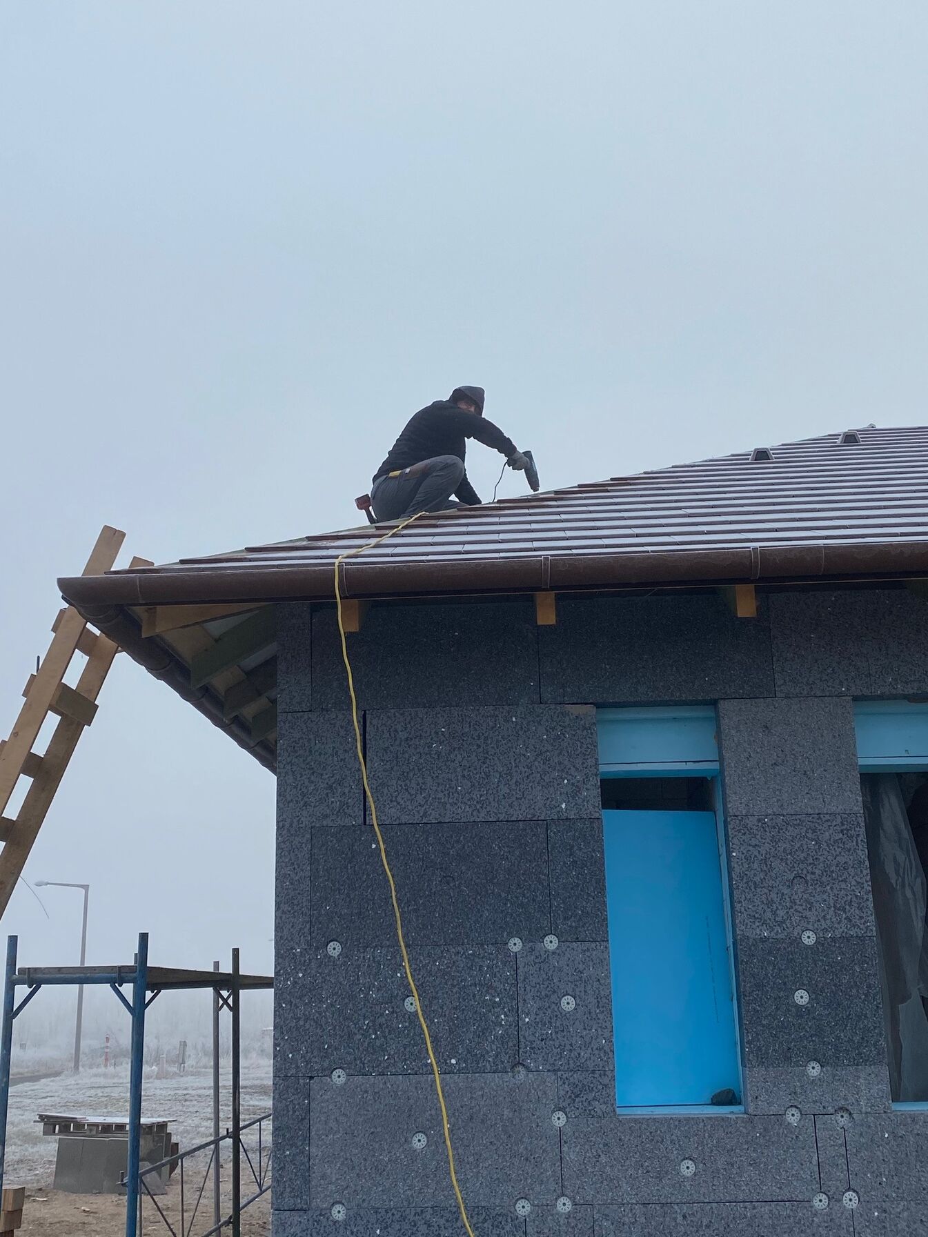 Tegnap annak ellenére hogy nehezen engedett a fagy a tetőn egész jól haladtunk. A végére be tudtunk vágni 2 komplett élt a négyből. Ma is jó volna ha mihamarabb biztonságosan lehetne mozogni a tetőn de ez nem tudom mikor fog bekövetkezni. Közben azért nem álldogálunk hanem a cserepet szabjuk a földön. Ma el kellene érnünk abba az állapotba hogy holnap befejezhessem teljesen. Majd alakul.