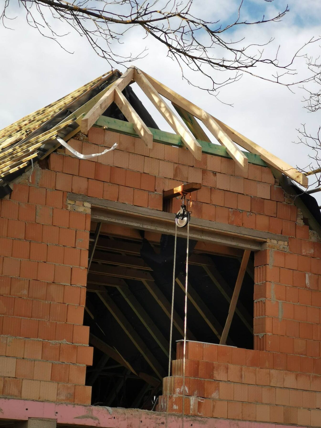 Tegnap befejeztem a segítséget ami pont még az idegrendszerem tűréshatárán mozgott. Megcsináltam a 3. csonkakontyot és felraktuk az oldalszegés alsó részét a nagy tetőrész két oldalára. A többit már majd megoldják ők.