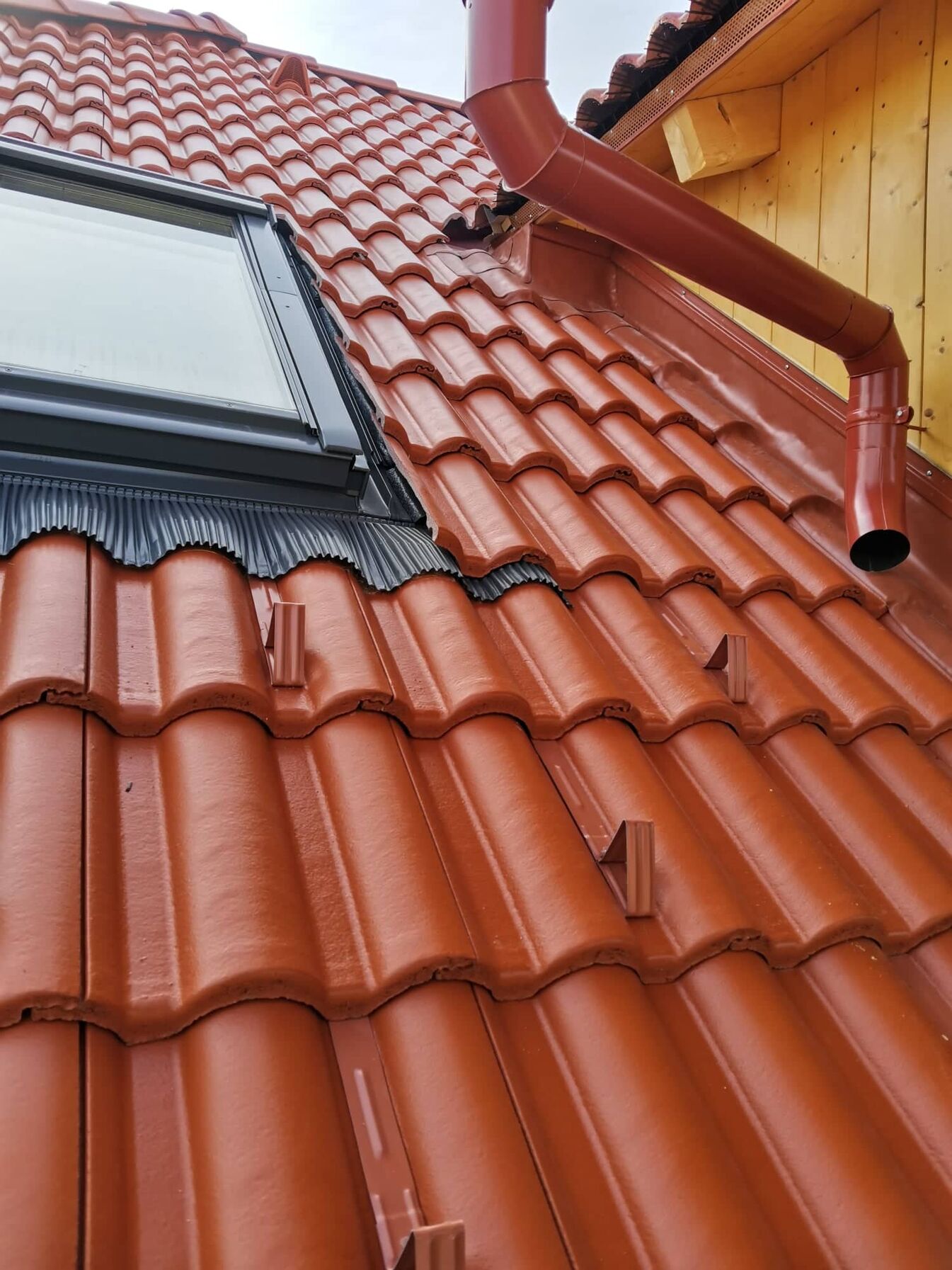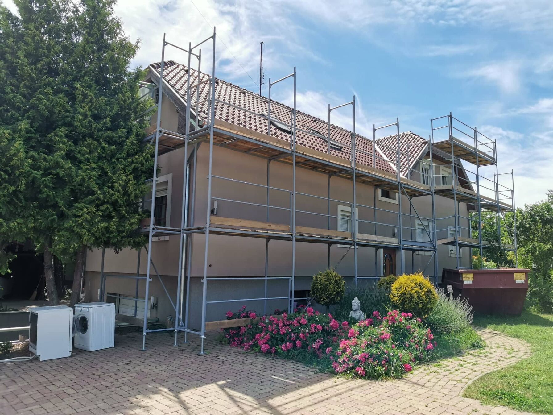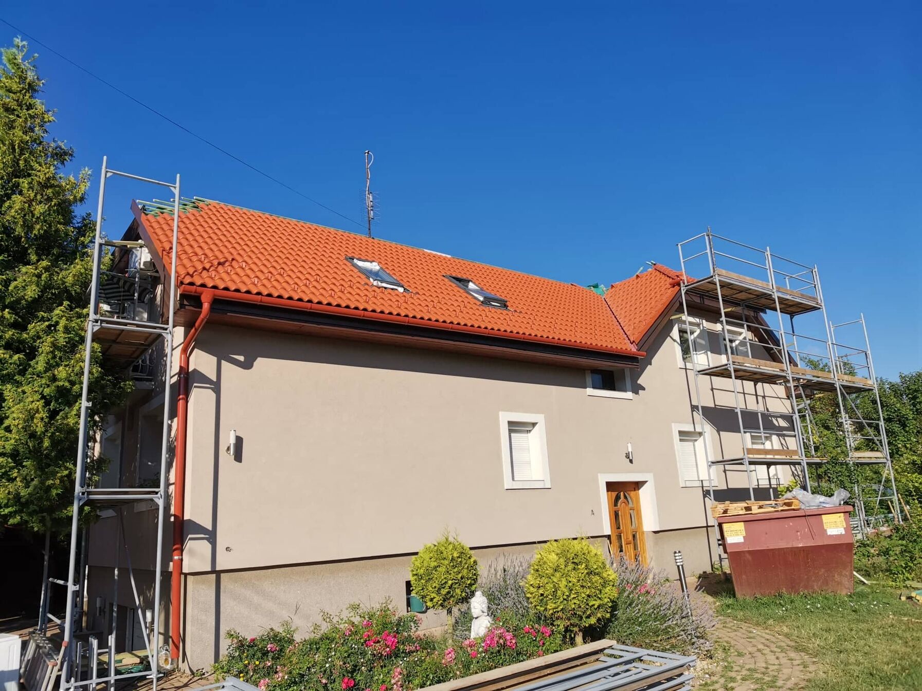 Tegnap picurka túlórával de befejeztük a kúpozást. Mára már csak a hiányzó alapcserepek felrakása maradt. Nem olyan sok de mivel magasan van ezért lehet hogy nem végzünk vele. Utána még a legvégére maradt egy lefolyócső és némi wakaflex. Utána állvány bontás. Úgy számoltam hogy mindennel megleszünk csütörtökre és pénteken elköltöztetjük az állványt.