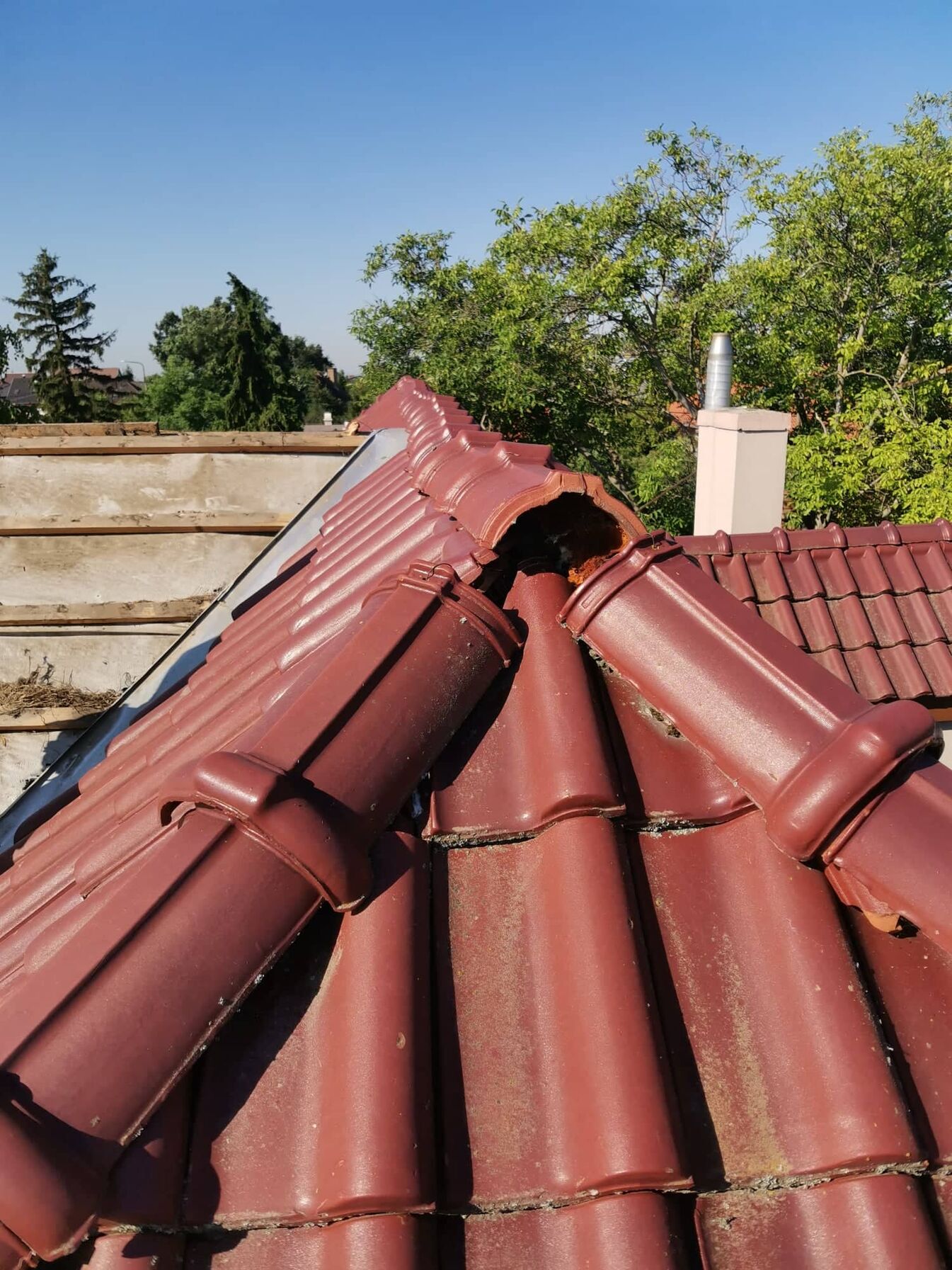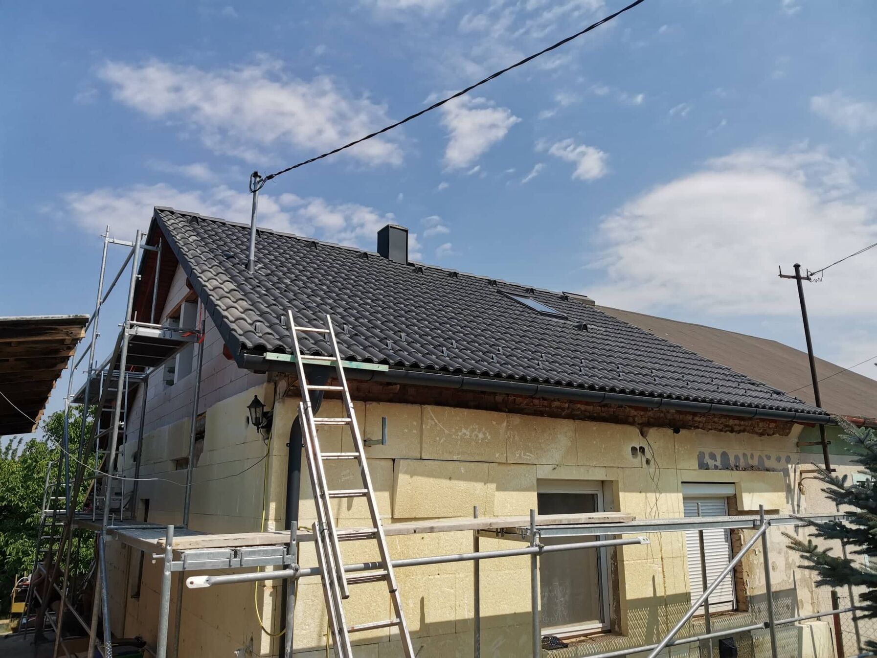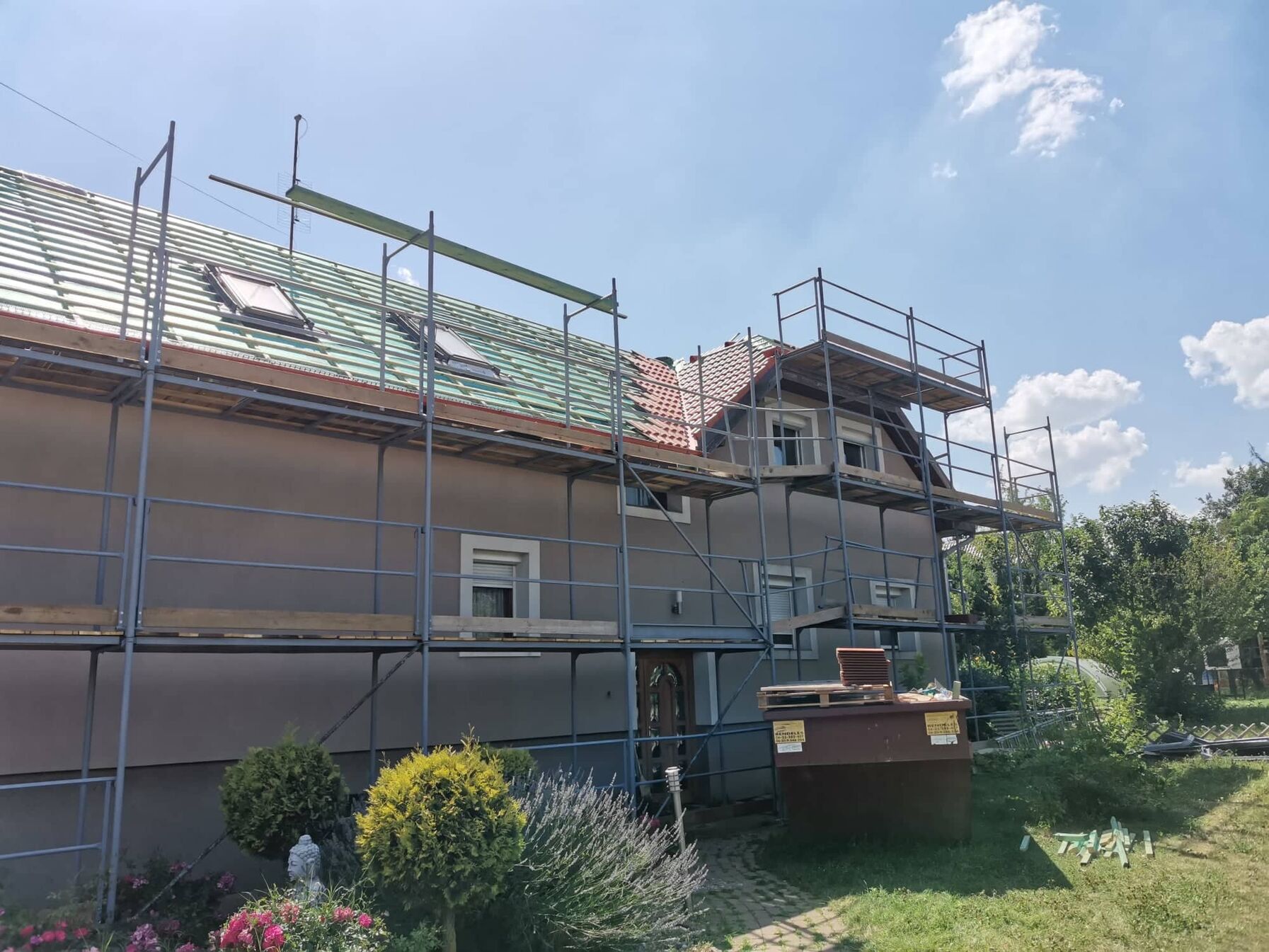 Tegnap volt egy kis cserepezés ,cserépvágással és kúpozással. Majd állványt bontottunk és építettünk. Ma egy részen újfent bontani fogunk a régi cserepet és szigetelünk plusz fóliázunk. Sajnos beértünk a vacakolós részbe ahol vápa és kutyaól is van egyszerre. Kevesebbet tudunk bontani egyszerre mert nagyon tördelt a sík. A héten remélem sikerül a végleges fóliát rárakni erre a részre is. Meglátjuk hogy a hőségben hogy tudunk haladni.