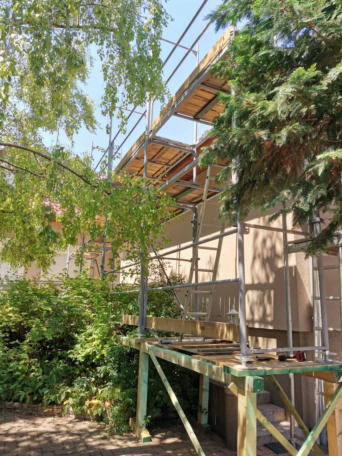 Tegnap mindent amit lehetett befejeztünk az állványon. Felcsavaroztuk a lábdeszkákat és az összes maradék deszkából trepnit gyártottunk. Ki is jött belőle még 20db. ami 7 hídra elegendő. Így most összesen 22 hídra van járófelületem. [kép]