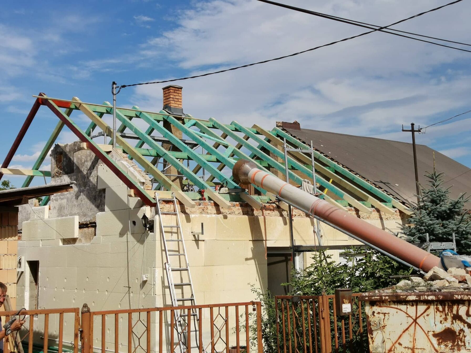Ma folytatjuk a megkezdett munkát egy kis cserepezéssel és állványozással. Holnap nagy bontás lesz és annak elő kell készülnünk.