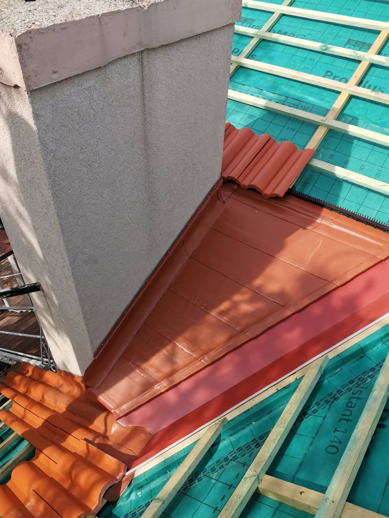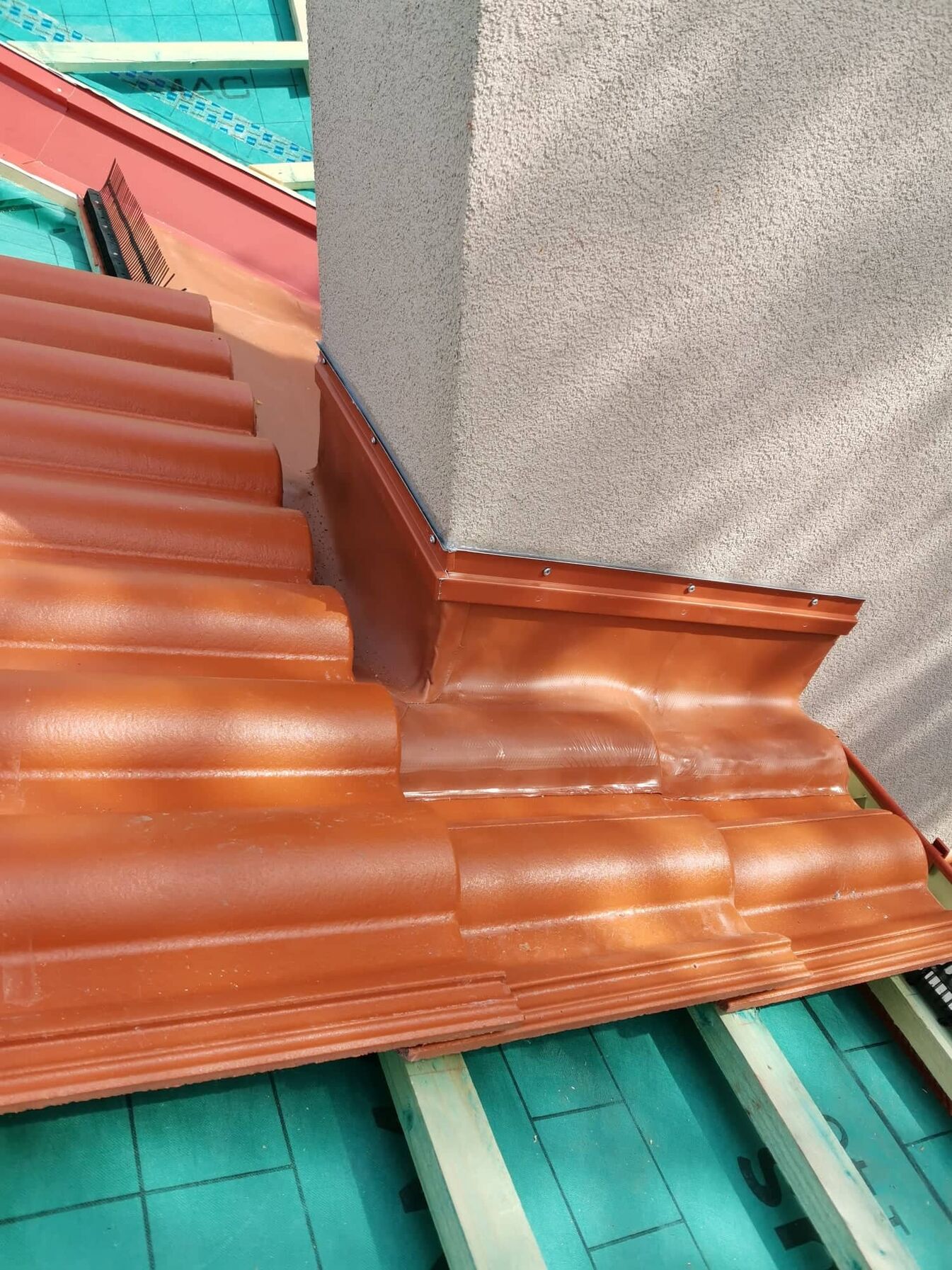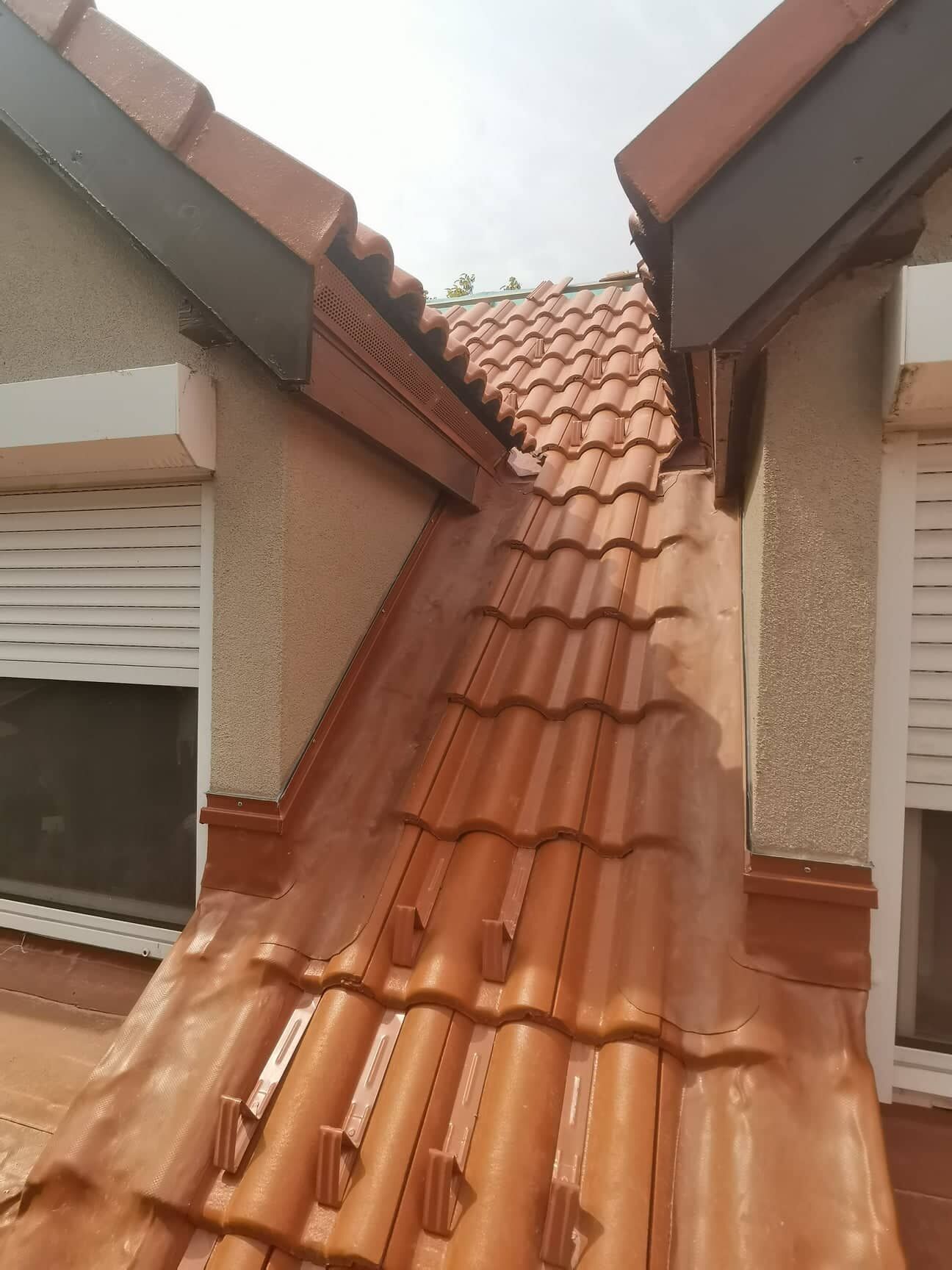 Sajnos tegnap nem tudtuk befejezni a bádogozást mert járulékos munka volt előtte amivel teljesen belassultam. Az hogy a vápabádogot be tudjam építeni cserepeznem és wakaflexeznem kellett elég sokat. Sajnos elég nehéz dolgozni a wakával ezért csak úgy viszi az időt. Maradt még mára a kémény körüli rész és a hátsó vápalemez. Nem tudom mi lesz a mai munkával mert most esik az eső.