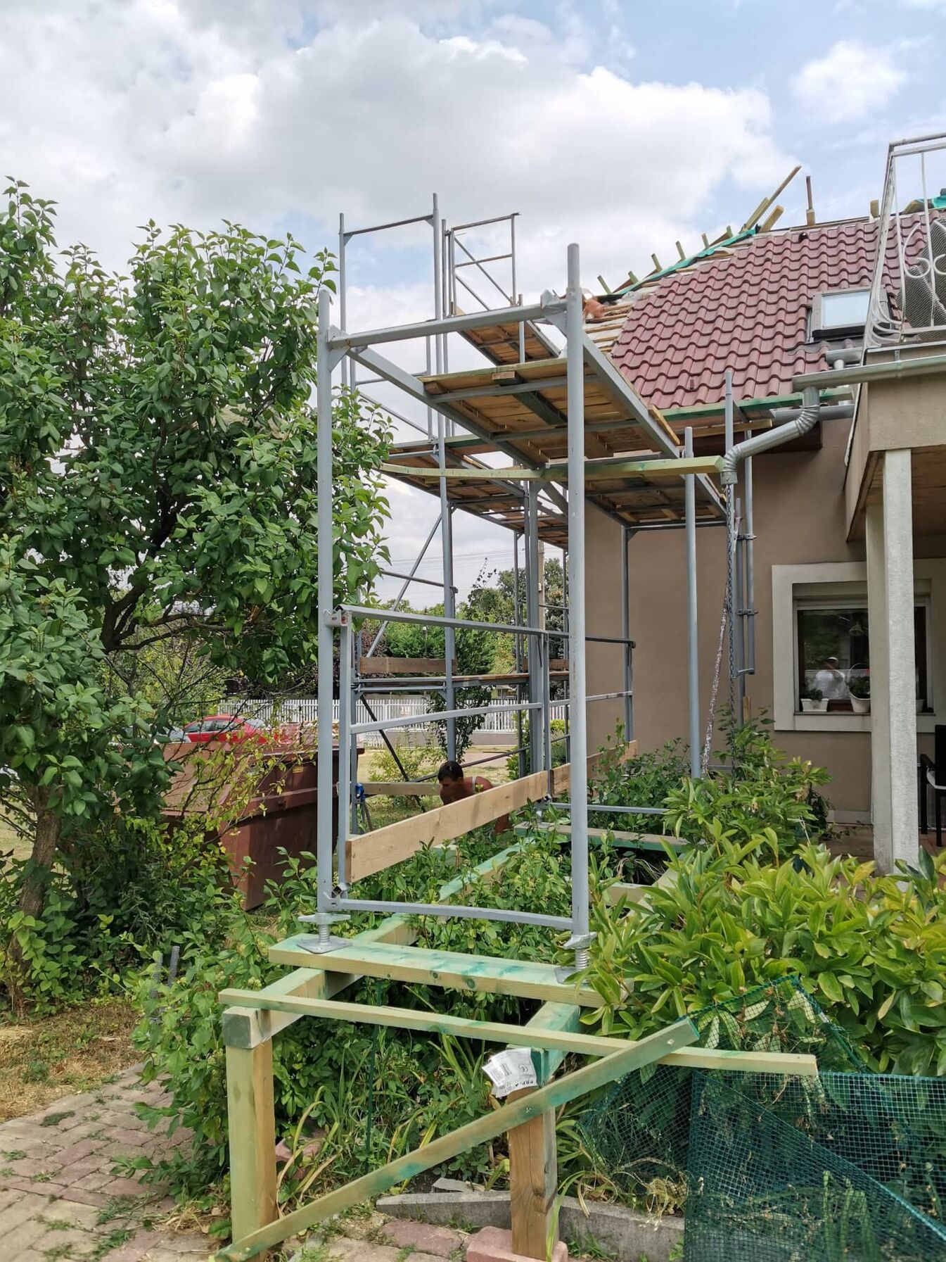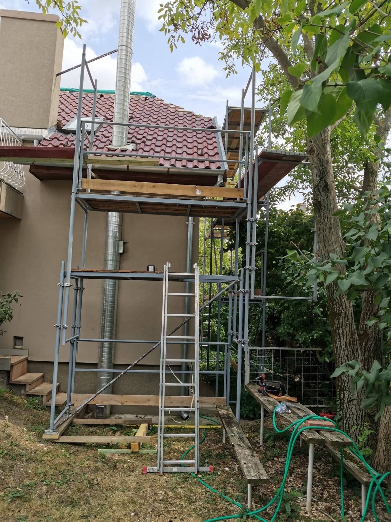 Tegnap nagyjából el is ment a nap azzal hogy elhurcoltuk az állványt. Ma felépítjük és ha marad még rá idő akkor nekiállunk leszedni a cserepet.