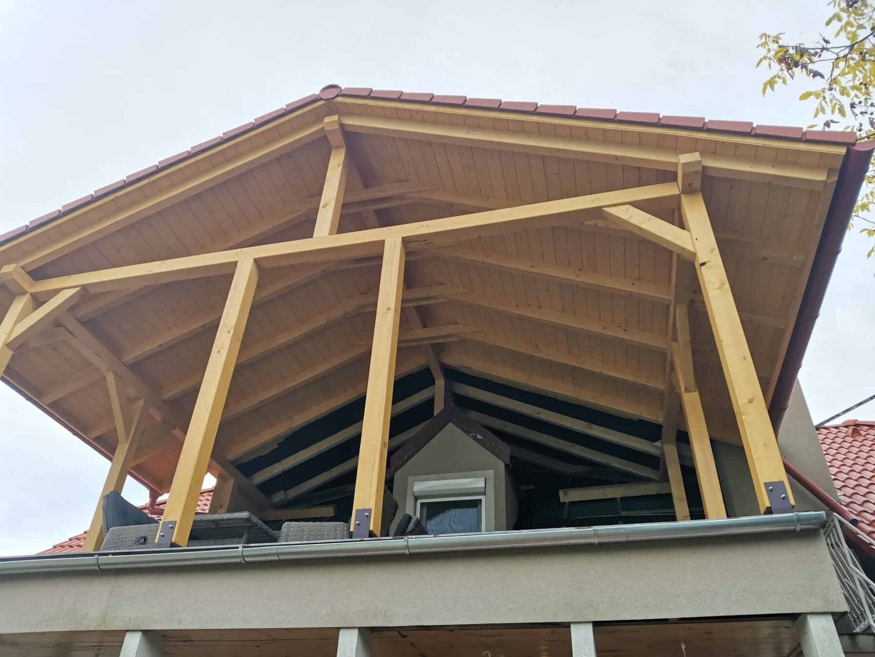 Ma 10x15 az általános méretezés. És nem elég hogy vékonyka a szarufa, de székállás és taréjszelemen sincs. Olyan mintha nem is ácsok készítették volna. Fólia ugyan van de nincs alatta ellenléc, tehát átszellőzés nulla.