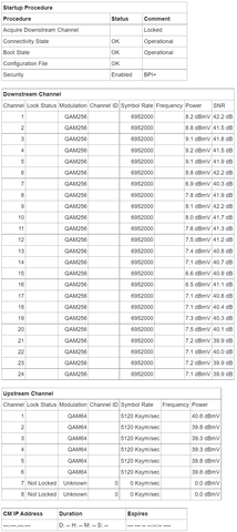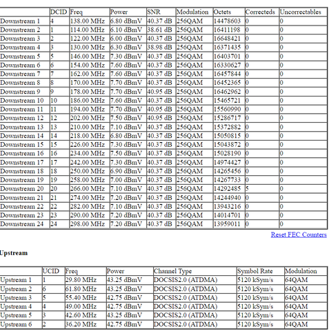 Kb egy két hete kezdődött az, hogy a net random megszakad fél percre. Először az arris csodára gyanakodtam, hogy attól van ezért tegnap beüzemeltem a helyére egy routert és az arris ment bridge módba. Viszont azóta is előfordul ez a hiba. Egy hónapja voltak kint megnézni, még az akkori bejelentés kapcsán, akkor megjavult, de azóta megint előjött. Érdekes, hogy a ciscoval sose volt ilyen probléma. Igaz, az kevesebb csatornát használt. Az is érdekes, hogy a modemértékeket mutató felületet se lehet elérni, amikor megszakad a kapcsolat. Ilyen modemértékeim vannak jelenleg: