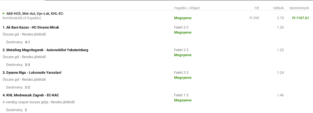 Egyébként az elég kemény, hogy a mai hokimeccsek közül csak kettőn nem jött az over 3,5. Kemény arány, pedig kb. annyit fizet mint focinál az over 1,5.