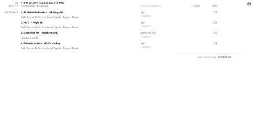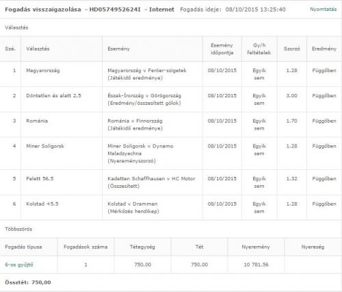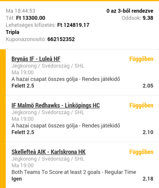 Pl. ottvan kicsit visszább az én Canadian kötésem. Legrosszabb esetben is visszajön 2 találatnál a tét, ha mind telibemegy, akkor a nyeremény 16-18 ezer körül.