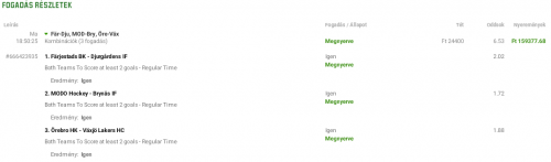 Mindkét csapat lő legalább 2 gólt, de látom már írta más is. Jó ez, de azért nem olyan egyszerű jó arányban eltalálni, főleg hármas/négyes kötésben, de KHL és SHL jól fizet, kisebb bajnokságoknál néha 1.4 alatt adnak erre.