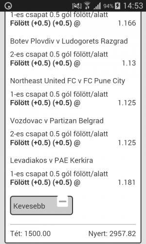 Mai nap elment az összes szelvényem de megtaláltam a real madrid- Barcelona 1 félidő gólszám több mint 1.5 szelvényt, már el is felejtettem hogy ezt 21-én raktam, 2 odds 7000ft tét-14k lett belőle. Mai nap ez is jól jött.