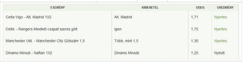A mai nap ment a benfica 1,45ért, és a nac breda-psv2 (0-2) v 1,5 oddsért 18390ből kerek 40. Hát nem tudom, nem hiszem hogy 3. napon is nyerni fogok...ki tudja, lehet ez egy szerencse széria.